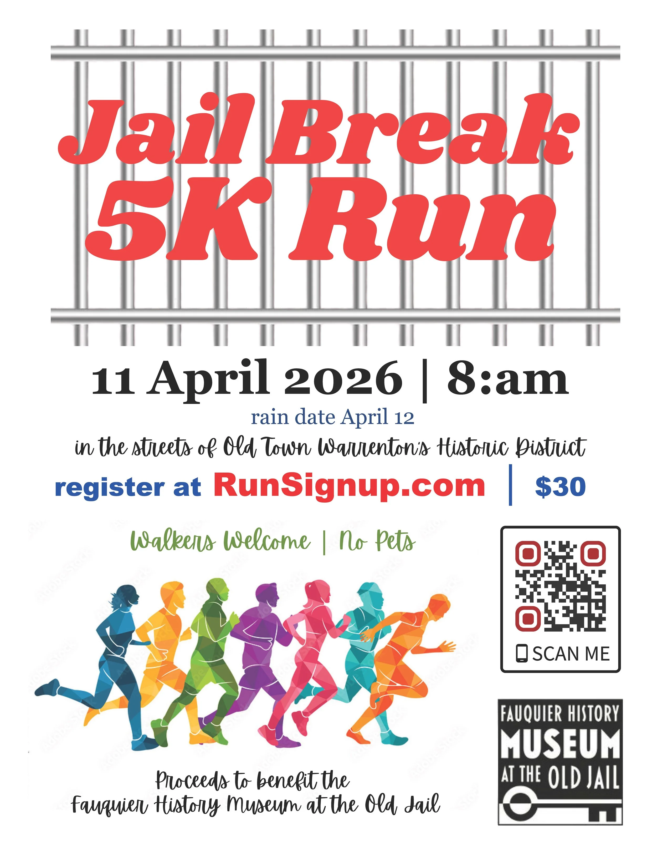 Join the fun of a 5K Run in the streets of Old Town Warrenton’s Historic District! Proceeds to benefit the Fauquier History Museum at the Old Jail. Entrance fee is $30. Walkers welcome, (sorry, no pets). Scan the QR code below.